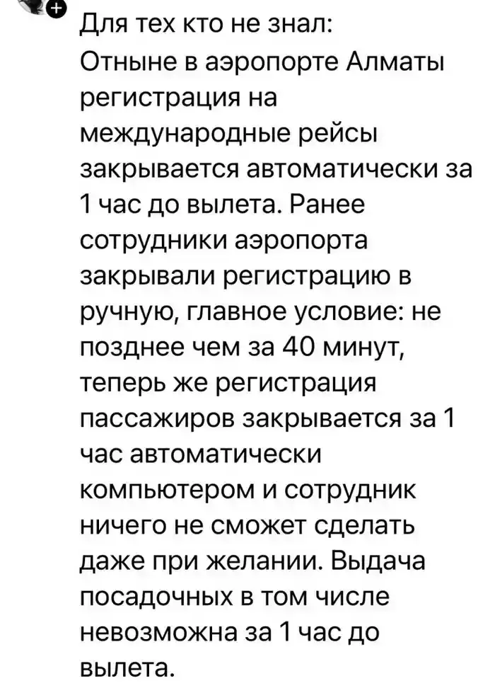 "Начиная с этого момента, автоматическая система будет закрывать регистрацию на международные рейсы за час до самолета в аэропорту Алматы. Ранее сотрудники делали это вручную, не позднее чем за 40 минут до отправления. Теперь компьютер автоматически завершает процесс, и даже сотрудники не смогут ничего изменить. Выдача посадочных билетов также прекращается за час до вылета", – сообщила одна из пользовательниц.