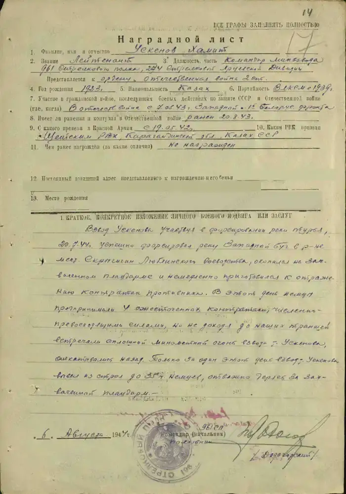 "О подвиге отца мы узнали из архивных данных, когда его самого уже не стало. Он был немногословен на эту тему. Оказывается, он руководил минометным взводом. 20 июля 1941 года в 04:30 утра его взвод в составе 961-го полка с ходу форсировал реку Западный Буг южнее Казимежа, в районе Кладнева, вступил на территорию Польши. В 10:00 в двух километрах севернее Скригичин они заняли три траншеи. Бойцы прочно закрепились и отразили яростные контратаки фашистов", - рассказал сын фронтовика Мурат Ускенов.