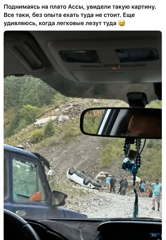 "Поднимаясь на плато Ассы, увидели такую картину. Всё-таки без опыта ехать туда не стоит. Ещё удивляюсь, когда легковые машины лезут туда", - говорится в публикации в соцсети.