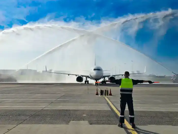 Как сообщили в авиакомпании, первый борт встретили эффектной водной аркой, а экипаж у трапа самолёта — караваем по белорусской традиции. Первых пассажиров нового рейса, как всегда, ждали приятные сладкие подарки.