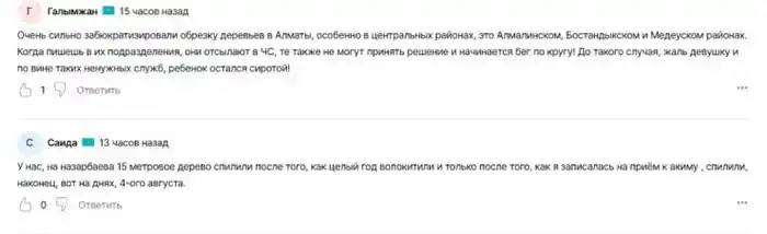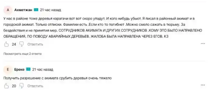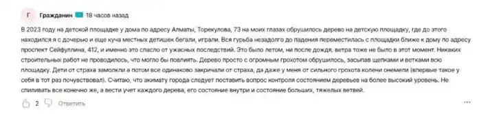 После трагедии с гибелью девушки, алматинцы выразили недовольство работой государственных органов, ответственных за состояние зеленого фонда и районных акиматов города.