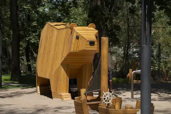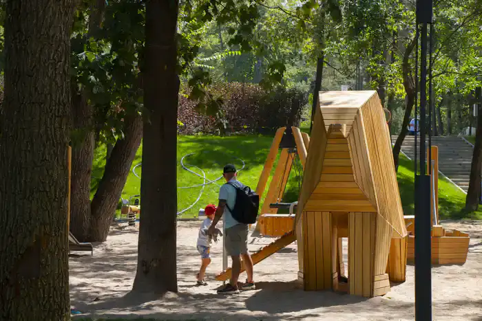 Воркаут-зона привлекает как молодежь, так и людей старшего возраста, а детская площадка выполнена из натурального дерева, что делает ее более экологичной.