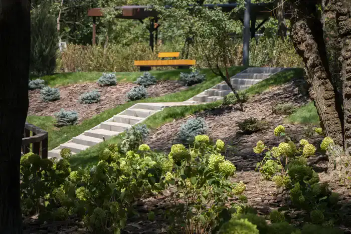Заметно, что проведена большая работа над ландшафтным дизайном: аккуратно уложенная брусчатка, лестницы на перепадах высоты и разнообразные декоративные растения создают приятную атмосферу.