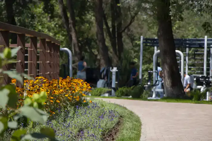 В акимате также отметили, что на территории установлено 30 новых скамеек, автоматический полив и современное освещение, три теннисных и четыре шахматных стола, зоны для воркаута, а также две современные детские площадки с игровой экозоной.
