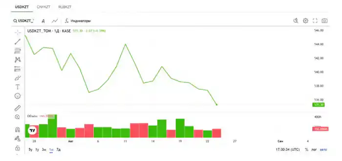 С начала августа курс доллара достигал максимума в 536,58 тенге (6 августа). Официальный курс Национального банка на 25 августа составляет 537,34 тенге за доллар.