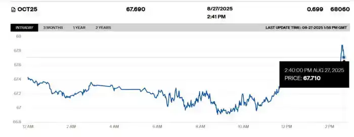 - Цена октябрьских фьючерсов на нефть марки Brent на лондонской бирже ICE поднялась на 0,69 процента - до 67,69 доллара за баррель.