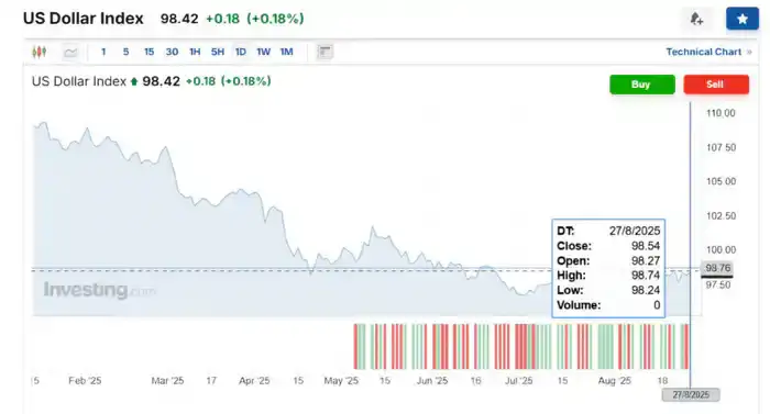 U.S. Dollar Index (DXY, курс доллара США по отношению к корзине основных мировых валют: евро, иена, фунт, канадский доллар, шведская крона, швейцарский франк) поднялся на 0,18 процента, поскольку на фоне политической напряжённости вокруг попытки увольнения главы ФРС и общей неопределённости инвесторы подталкивали доллар вверх как более надёжную валюту.
