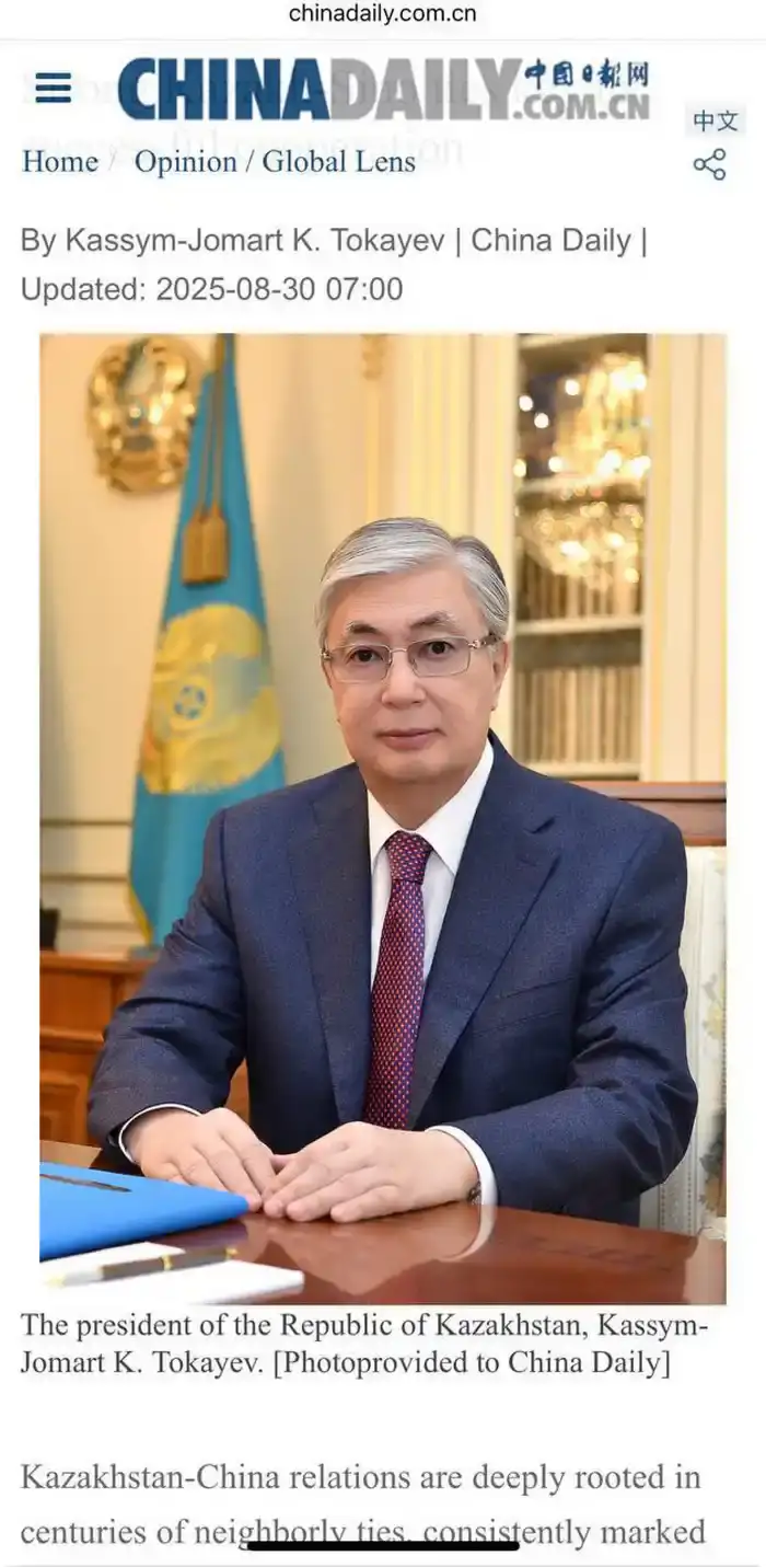 Сегодня в популярной англоязычной китайской газете China Daily опубликована статья Президента Касым-Жомарта Токаева Strong Kazakh-Sino ties key to successful cooperation ("Прочные казахско-китайские отношения - ключ к успешному сотрудничеству").