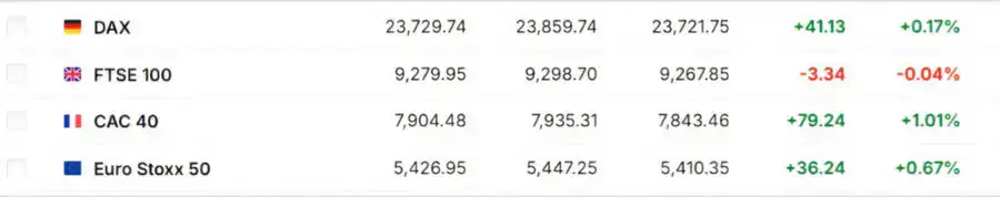 Европейские рынки показали положительную динамику на фоне ожиданий ключевых решений центральных банков. Индексы DAX (+0,17 процента, Германия), CAC 40 (+1,01 процента, Франция) и Euro Stoxx 50 (+0,67 процента) оказались в плюсе, в то время как FTSE 100 немного снизился (-0,04 процента, Великобритания).