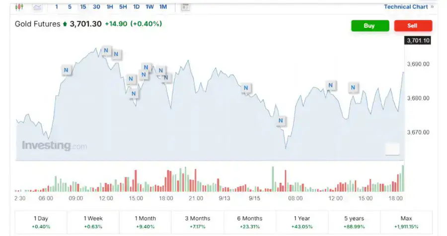 Золото пробило исторический максимум на фоне неопределённости в мировой экономике и ожидания снижения процентной ставки ФРС США. Фьючерс на золото повысился на 0,40 процента - до 3 701,30 доллара за унцию.