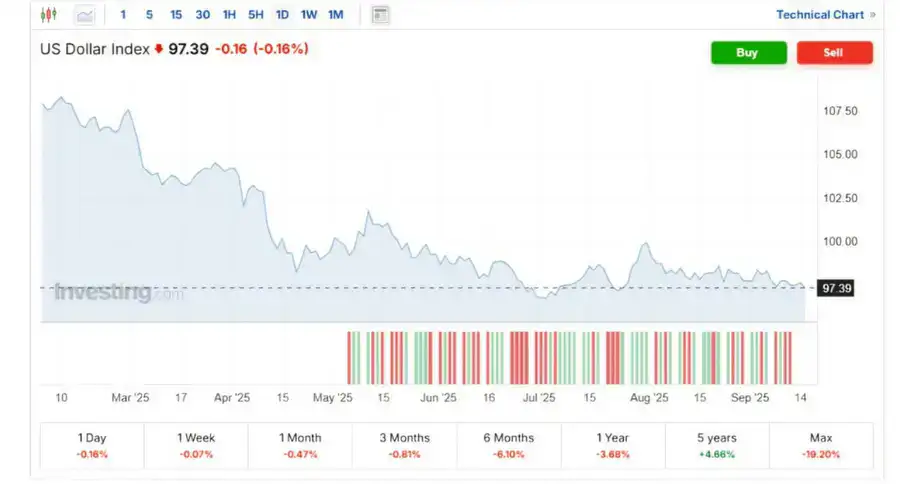 U.S. Dollar Index (DXY) ослаб на 0,16 процента на фоне ожиданий снижения процентной ставки ФРС США и слабых данных по рынку труда.