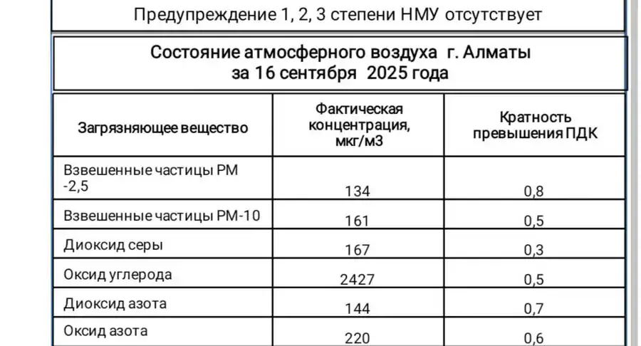 Скрин с сайта "Казгидромет", согласно которому концентрация веществ превышает ПДК на 0.5 - 0.8. То есть в пределах нормы