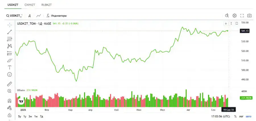 На Казахстанской фондовой бирже (KASE) по состоянию на 17:00 по времени Астаны средневзвешенный курс доллара составил 541,34 тенге, увеличившись на 0,06 тенге. Официальный курс Национального банка на 19 сентября также составляет 541,34 тенге за доллар.