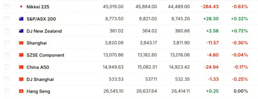 Азиатские рынки закрылись в красной зоне. Сильный доллар и рост доходности американских облигаций делают рисковые активы менее привлекательными, что негативно сказывается на рынках Китая и Японии. Индекс Shanghai Composite упал на 0,30 процента, а японский индекс Nikkei 225 снизился на 0,63 процента.
