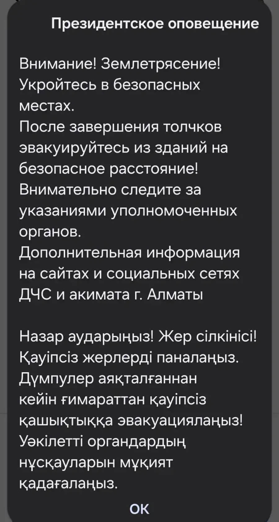 Алматинцам на мобильные телефоны стали приходить оповещения о землетрясении, передаёт корреспондент.