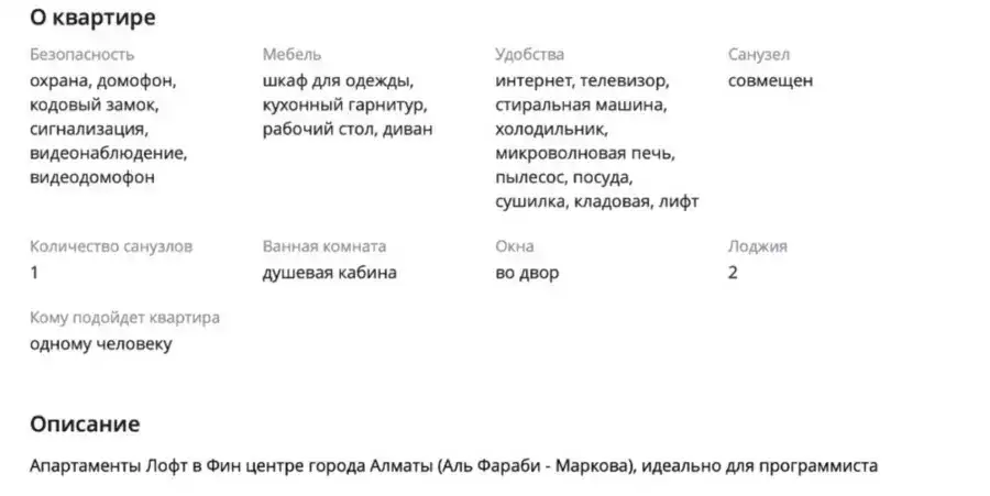 В объявлении уточняется, что речь идёт об однокомнатной квартире - "апартаментах в стиле лофт", расположенной в финансовом центре Алматы на пересечении проспекта Аль-Фараби и улицы Маркова. Отмечается, что это жильё станет отличным вариантом и "идеально подойдёт для программиста".