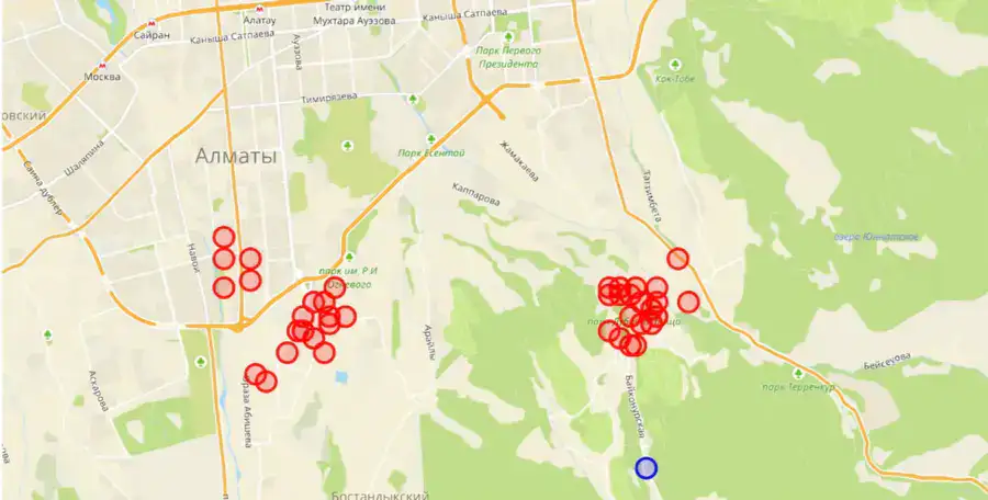 В Алматы также произошли аварийные отключения электроэнергии. По данным карты аварийных ситуаций "Алатау жарық компаниясы", без электричества остались следующие районы: