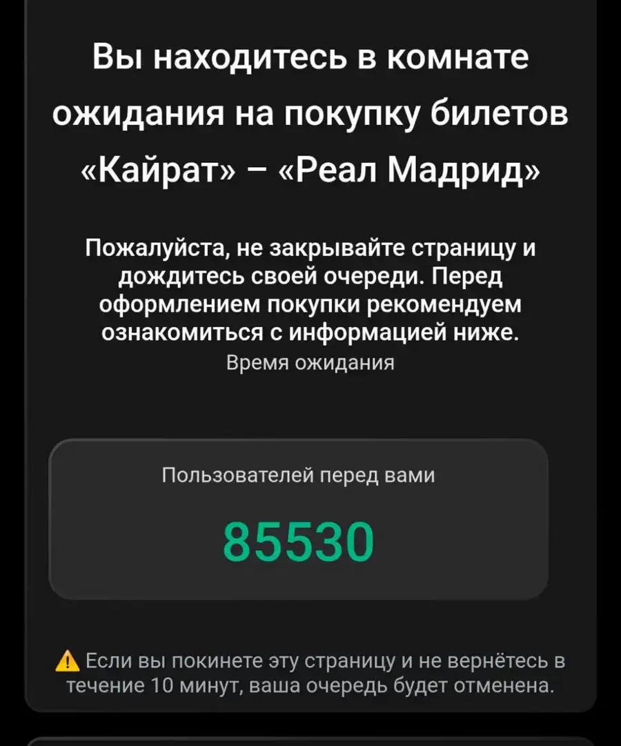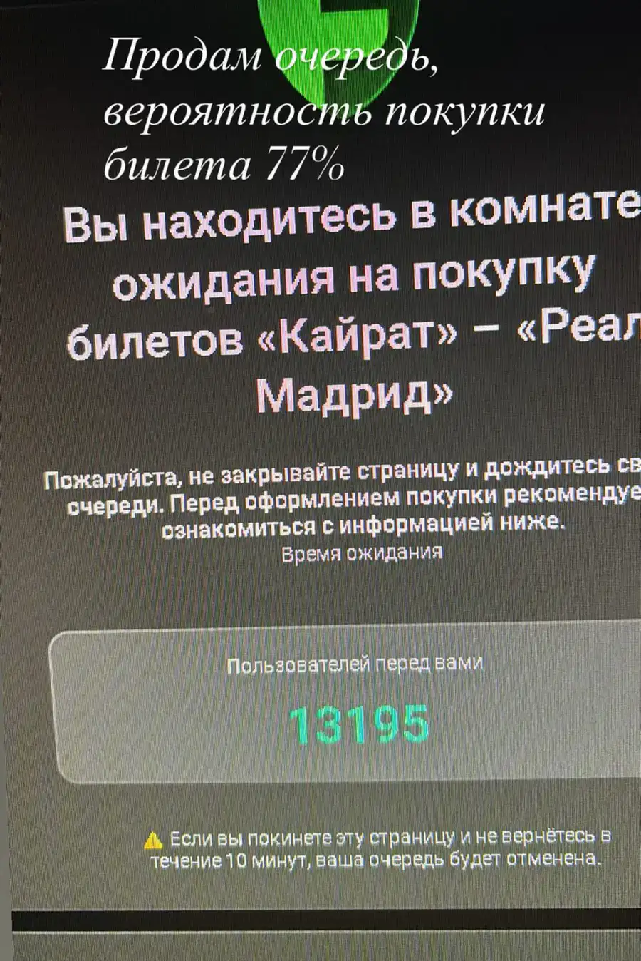 За 10 минут до старта мы открыли три вкладки: официальный сайт клуба, платформу и приложение Qairat SuperApp. Организаторы заранее предупреждали о формировании виртуальной очереди, поэтому мы ожидали, наблюдая за счётчиком на экране.