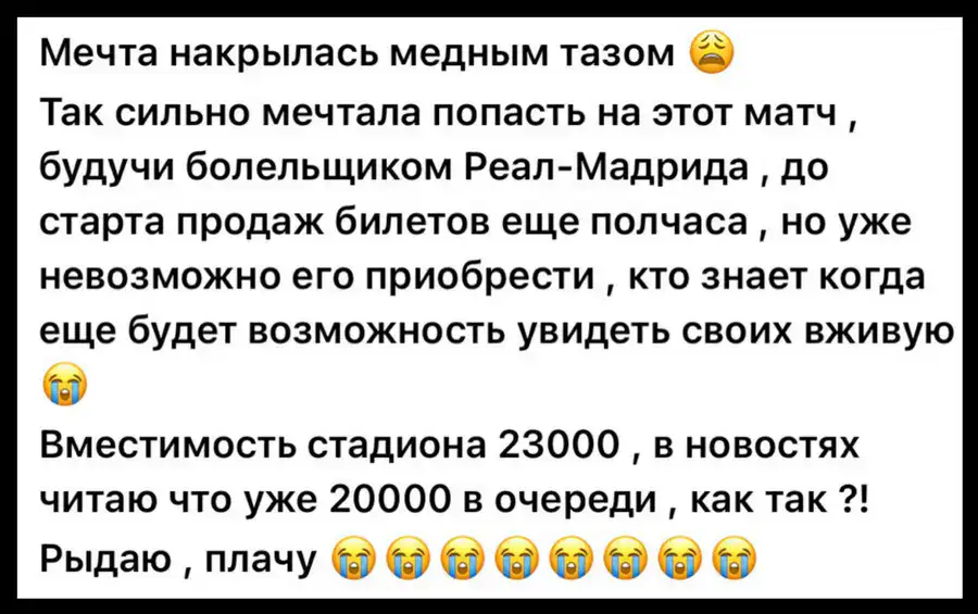 К сожалению, нам не удалось приобрести билеты на матч, хотя мы ждали более четырёх часов. Около 21:40 все места были раскуплены.