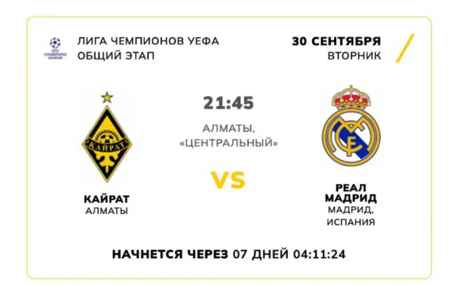 Матч между "Кайратом" и "Реалом" запланирован на 30 сентября.