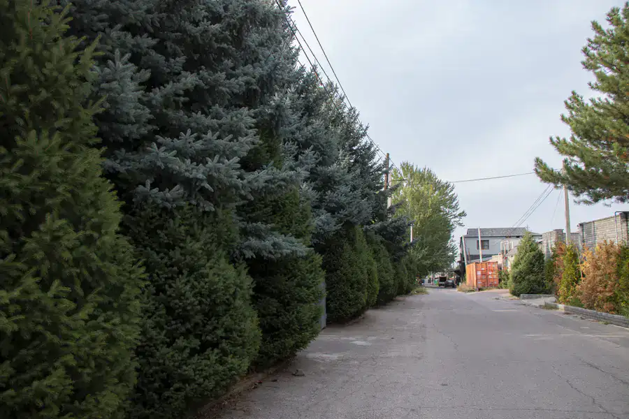 На улице растут высокие хвойные деревья, а чуть ниже высажены молодые тополи, придающие ей живописный вид.