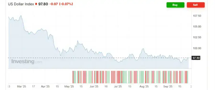 Индекс доллара США (U.S. Dollar Index, DXY) ослаб на 0,07 процента. Небольшое снижение индекса связано с ростом ожиданий, что Федеральная резервная система США может снова снизить ставки в октябре, а также с геополитической напряженностью в мире.
