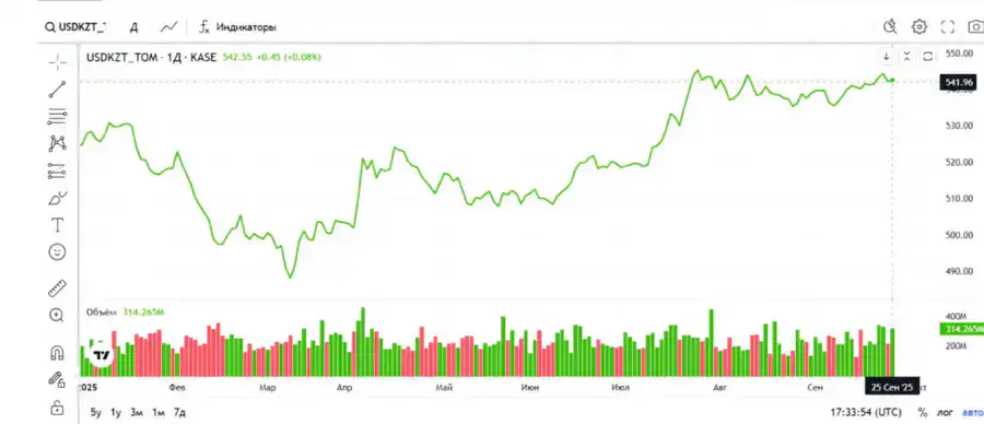 По итогам торгов на Казахстанской фондовой бирже (KASE, на 17:00 по времени Астаны) средневзвешенный курс доллара составил 541,81 тенге, понизившись на 0,79 тенге. Официальный курс Национального банка на 25 сентября составляет 542,8 тенге за доллар.