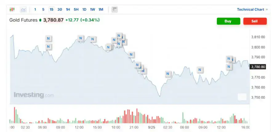 Фьючерс на золото повысился на 0,34 процента - до 3 780,87 доллара за унцию.