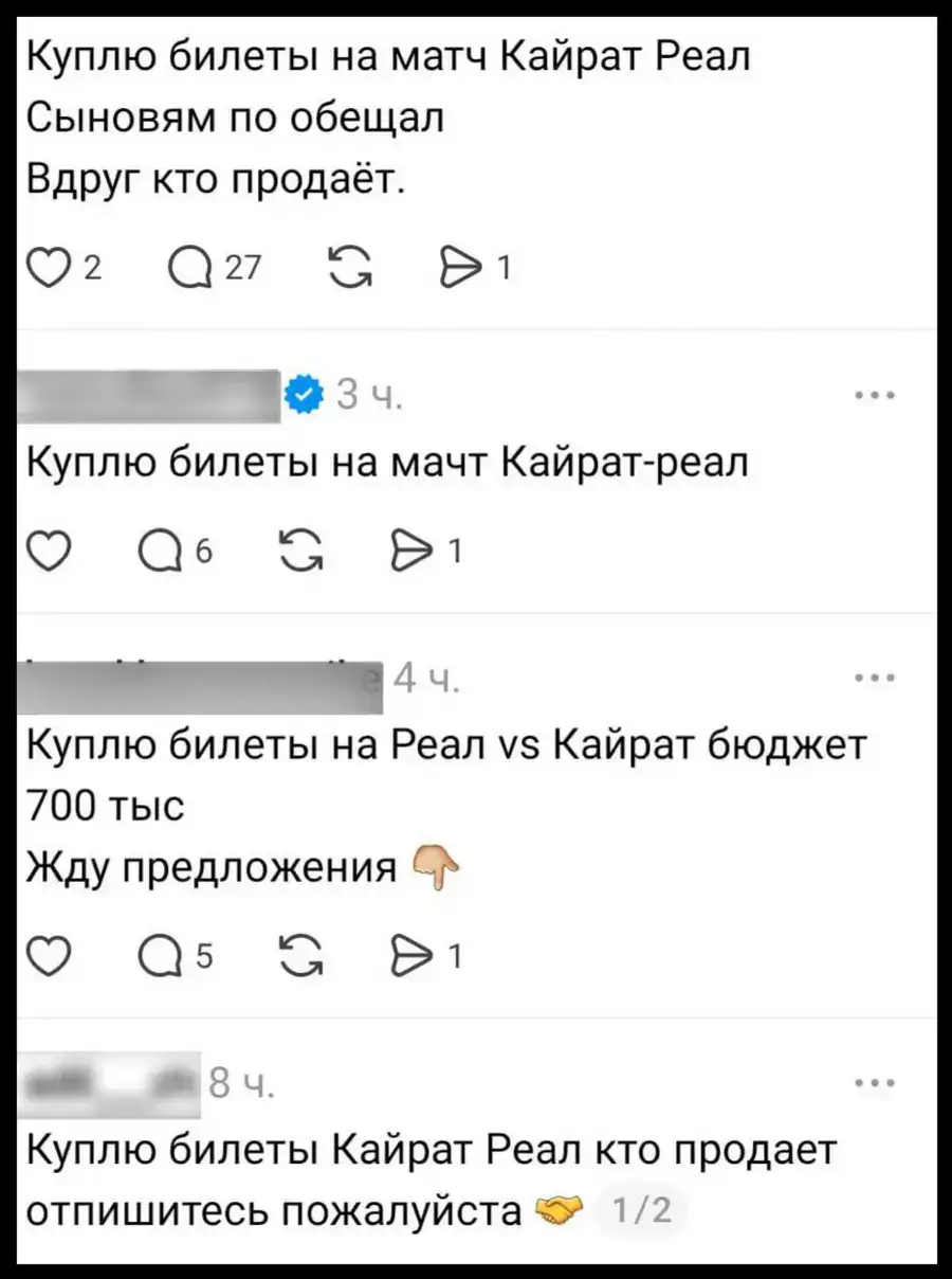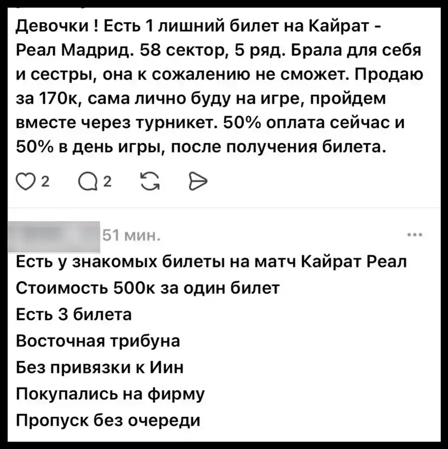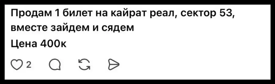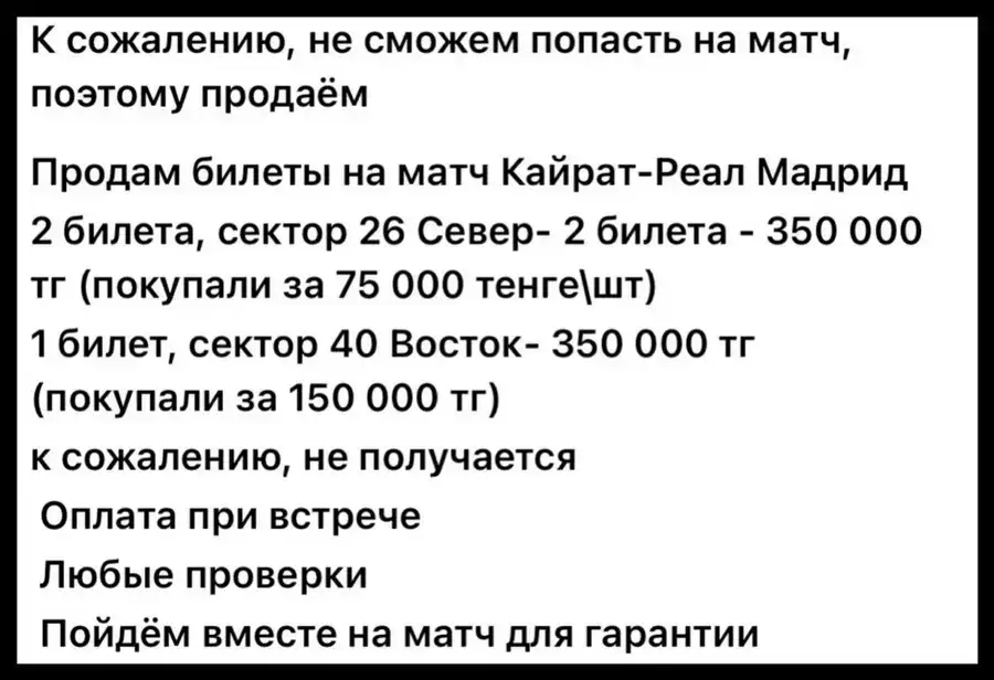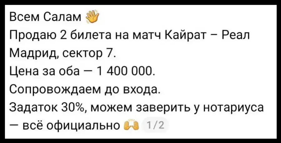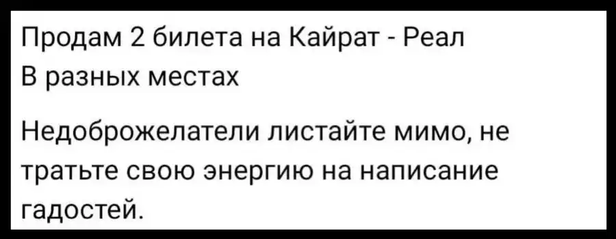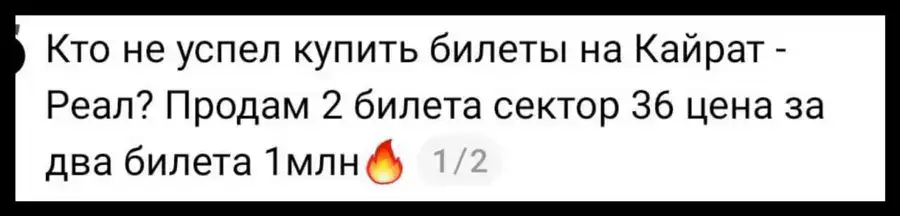 Одно из объявлений привлекло внимание: два билета на матч были выставлены за 1,4 миллиона тенге. Надеемся, что это всего лишь шутка.