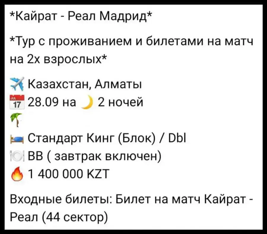 Билеты на матч Лиги чемпионов между алматинским "Кайратом" и мадридским "Реалом" стали объектом активной перепродажи в Казахстане. В связи с высоким интересом к событию, многие перекупщики начали выставлять свои предложения на различных платформах.