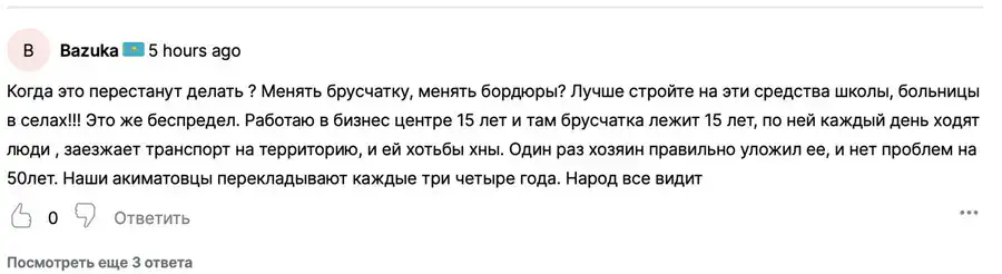 Ситуация с брусчаткой на улице Уалиханова вызвала общественное недовольство. Житель Алматинской области заявил, что купил плитку, в то время как акимат утверждал, что она была передана нуждающейся семье.
