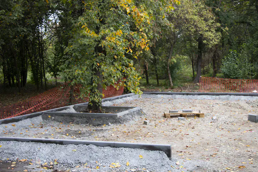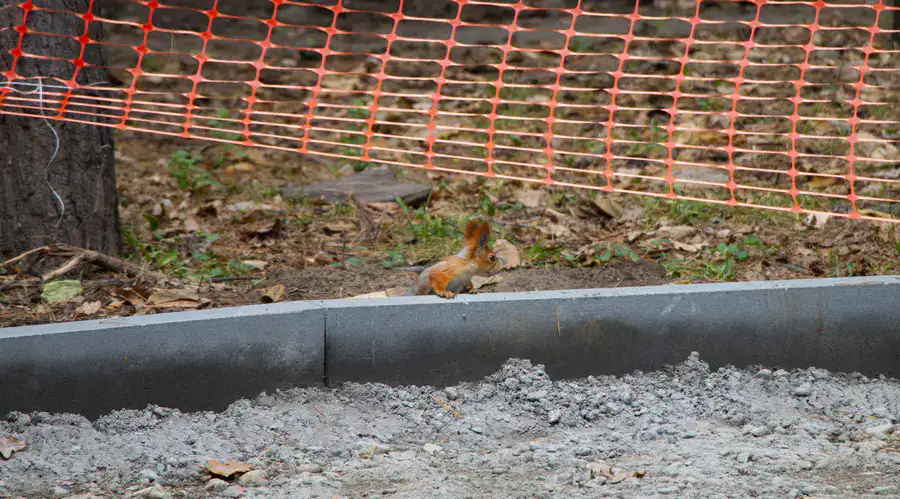 Работы начинаются со входов в рощу, расположенных рядом с Большим алматинским каналом. Место работ огорожено оранжевой сеткой. По левой стороне видны залитые бетоном бордюры.