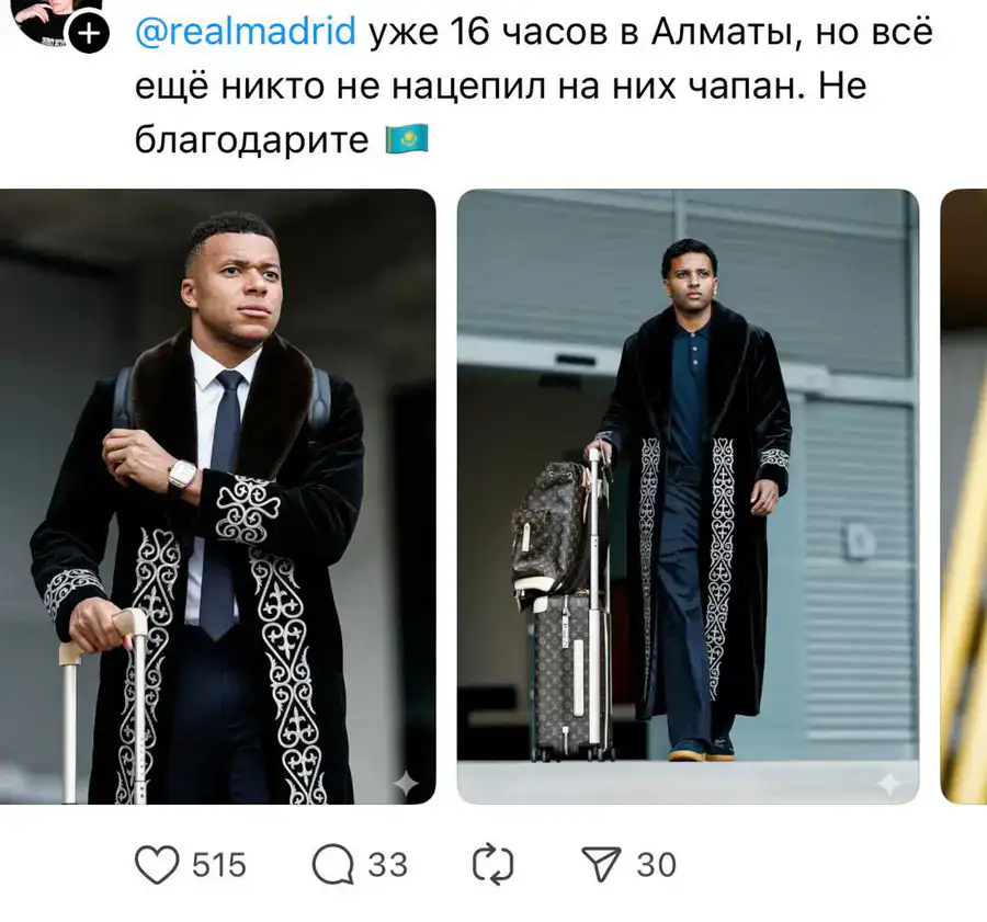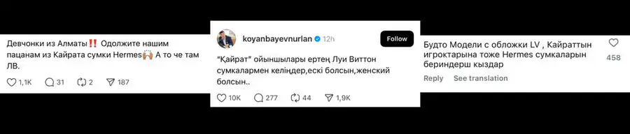 "Девчонки из Алматы, одолжите нашим пацанам из 'Кайрата' сумки Hermes. А то что там LV", — шутят пользователи.