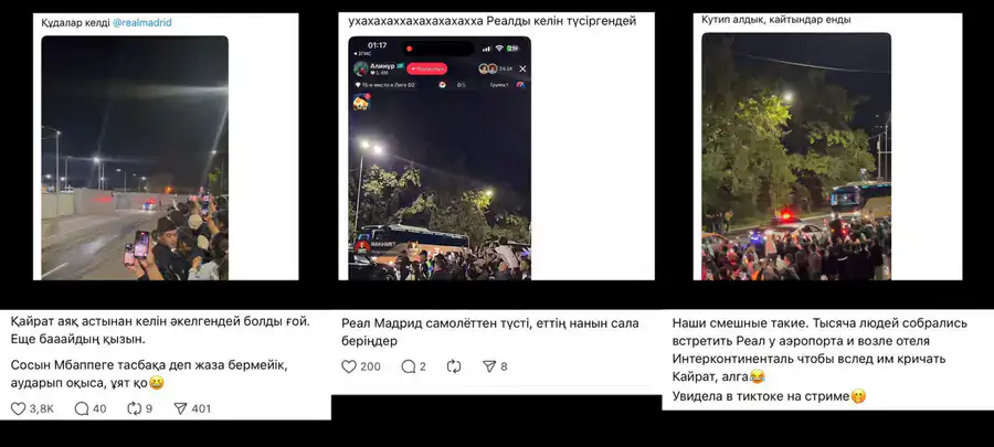 В социальных сетях появились сотни видео с казахстанскими фанатами, которые встречали "Реал" в аэропорту.