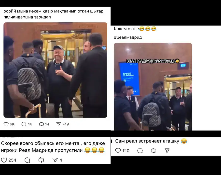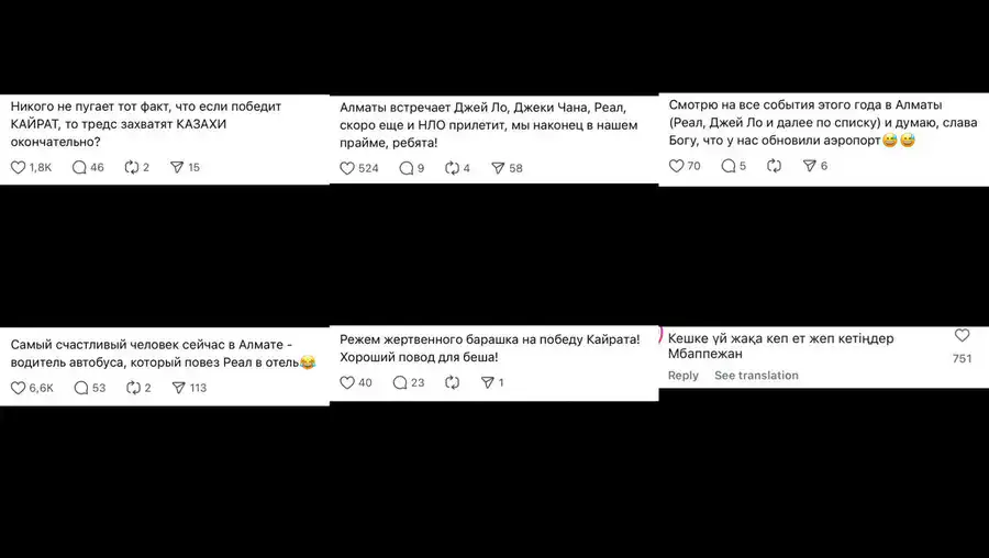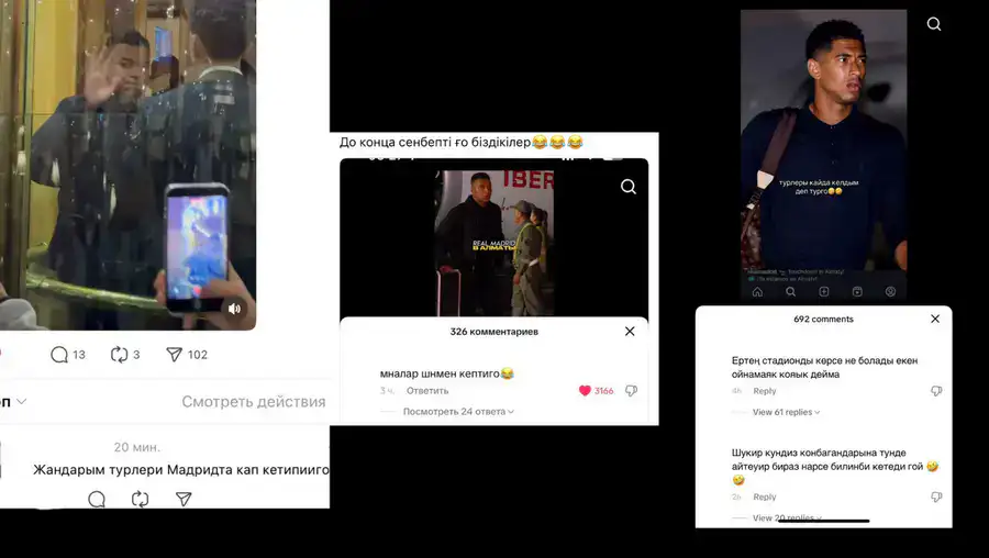 "Удачи Шерхану!", "Кто работает в отеле — публикуйте фото и видео, молча не сидите", "Кто-то передал посылку через игроков 'Реала'", — шутят казахстанцы.