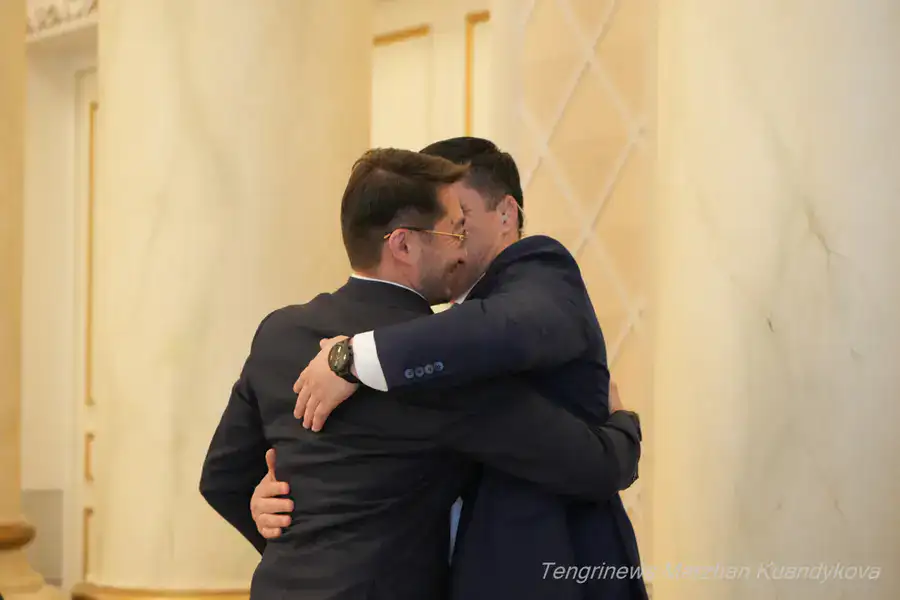 Жаслан Мадиев, как и его коллеги, был в центре внимания, но не смог уделить время журналистам, сказав, что спешит по делам. Однако он нашел время для крепких объятий с сотрудником Службы государственной охраны, который решил поздравить нового министра ИИ.