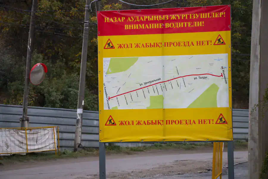 Траншея для прокладки труб местами уже заделана асфальтом, однако в других местах она продолжает быть источником проблем для автомобилистов. На улице Талды траншею засыпали не так давно, и здесь все еще есть знаки о перекрытии дороги.