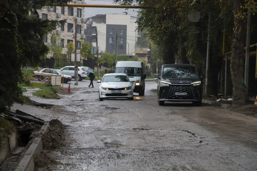 Даже в небольшой дождь на дороге образуются ручьи воды, так как продуманной системы ливнёвок здесь пока не предусмотрели. Похожая ситуация наблюдается на дороге рядом с жилыми комплексами Sakura и Grande Vie, где грязь и разбитые дороги создают дополнительные проблемы для жителей.