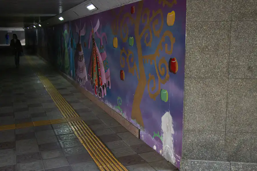 Полная противоположность увиденному на Жарокова – это подземный переход на улице Жандосова, расположенный рядом с территорией бывшего плодоконсервного комбината.