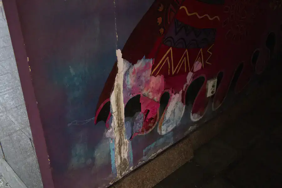 Освещение в самом пешеходном переходе есть, но тусклое. Местами из-за сырости со стен отвалилась штукатурка. При этом пол и потолок не утратили свой изначальный вид.