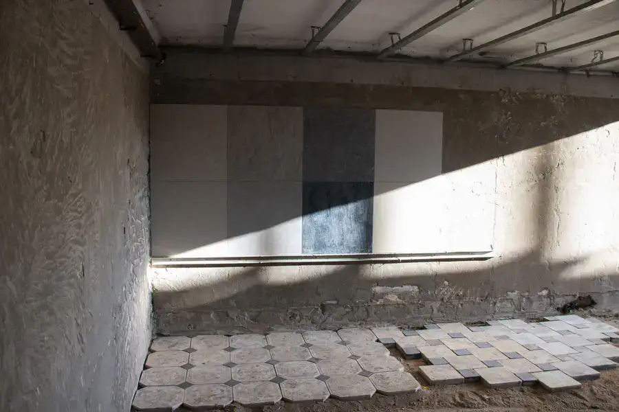 На одной из стен можно заметить несколько видов кафеля, под ними несколько видов брусчатки на полу. Вероятно, подрядчик сделал это для выбора наиболее подходящих вариантов.