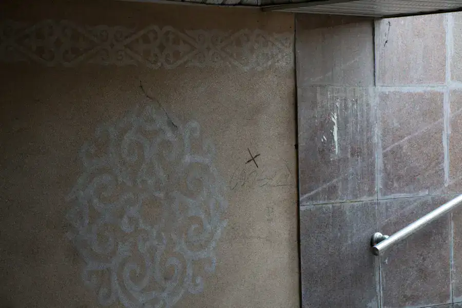 Еще один переход рядом с развязкой на Жандосова - Сатпаева - Байзакова выглядит хорошо в тех местах, где изначально при отделке стен использовалась плитка.