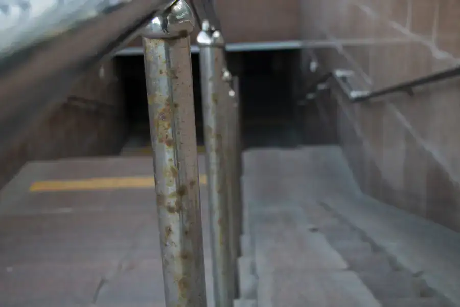 Сам переход не производит впечатления непригодного к использованию, хотя видно, что местами он уже подвергался ремонту. Поручни покрылись коррозией.