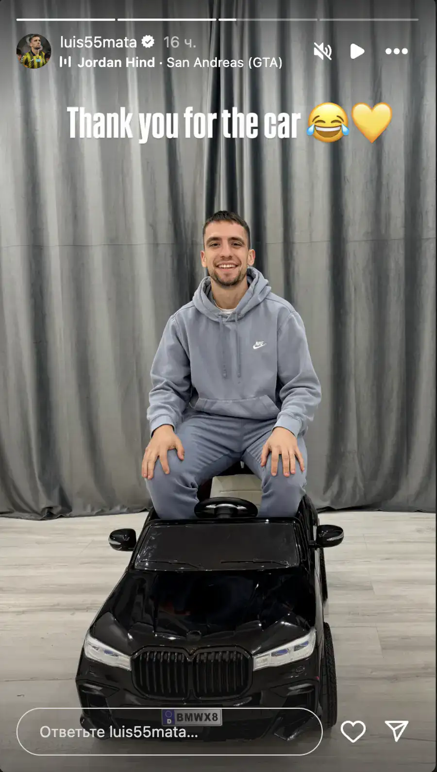 Защитник алматинского "Кайрата" Луиш Мата продемонстрировал свою новую "машину" в социальных сетях. Португалец поделился фото с игрушечной машинкой, выложив сторис.