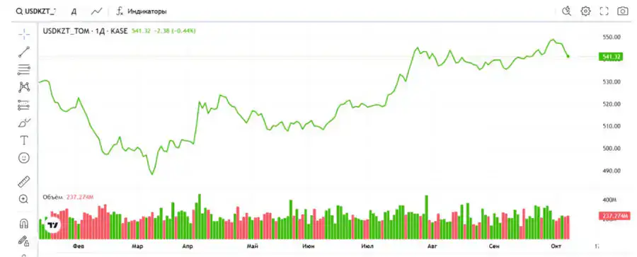 На Казахстанской фондовой бирже (KASE) средневзвешенный курс доллара на 17:00 по времени Астаны составил 541,45 тенге, что на 3,81 тенге ниже предыдущего значения. Официальный курс Национального банка на 7 октября составляет 545,67 тенге за доллар.