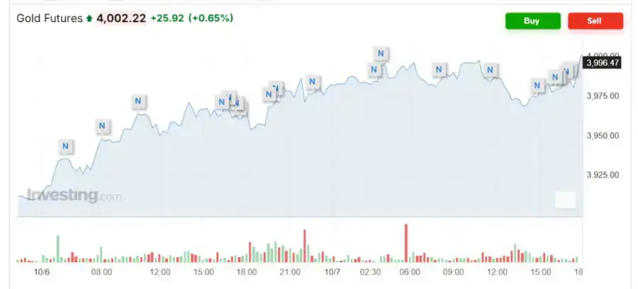 Золото обновило рекордный максимум, поднявшись выше 4 000 долларов за унцию. Это связано с продолжающейся политической и экономической неопределённостью в мире, включая шатдаун правительства США. Фьючерс на золото повысился на 0,65 процента и достиг 4 002,22 доллара за унцию.
