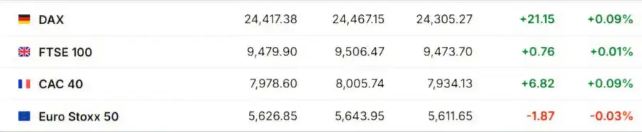 Европейские рынки в целом показали положительную динамику. Основные индексы: FTSE 100 (+0,01 процента, Великобритания), CAC 40 (+0,09 процента, Франция) и DAX (+0,09 процента, Германия) оказались в плюсе. Однако Euro Stoxx 50 (-0,03 процента) показал снижение.
