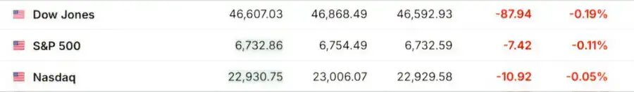 Американские рынки открылись в красной зоне из-за неопределённости в экономике на фоне шатдауна правительства США и ожиданий действий Федеральной резервной системы в отношении процентных ставок. Инвесторы также проявляют осторожность из-за потенциальных проблем в отдельных компаниях и слабого объёма свежих экономических данных. Индекс Dow Jones снизился на 0,19 процента, S&P 500 - на 0,11 процента, NASDAQ - на 0,05 процента.