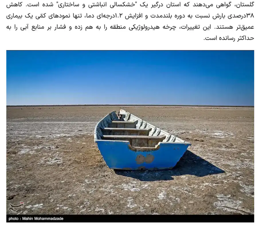 Климатолог Нассер Карами также подчеркивает, что водный кризис в Иране — это не только результат засухи, но и следствие неэффективного управления ресурсами и аграрной политики. Он указывает на чрезмерное водопотребление сельского хозяйства, которое использует более 90% пресной воды, но вносит лишь 9-12% в ВВП.