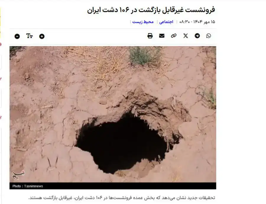 Кроме того, в стране наблюдается просадка грунта, угрожающая жизни тысяч иранцев, так как чрезмерное использование подземных вод приводит к образованию пустот под землёй.